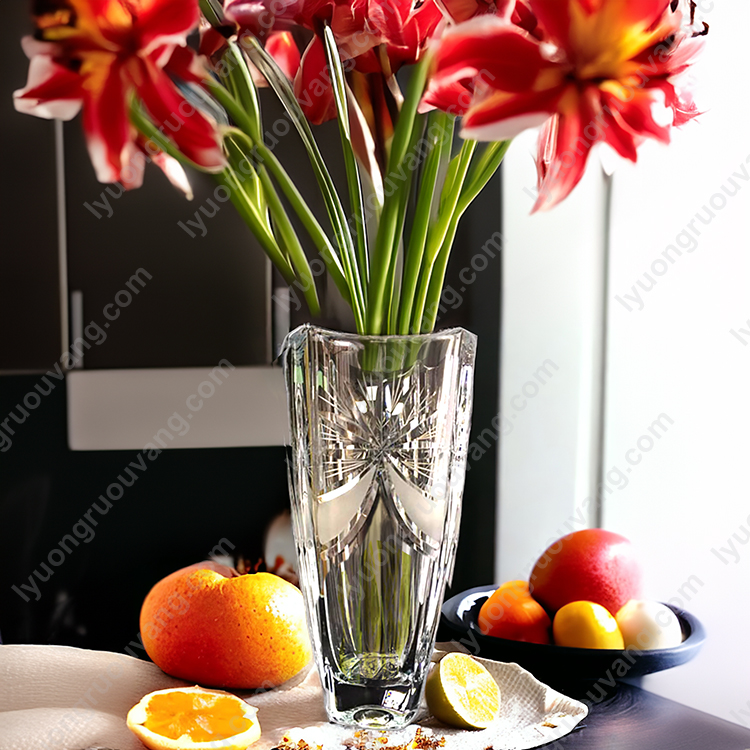 • Bình bông pha lê mạ vàng dáng trụ đắp nổi hoa cổ điển