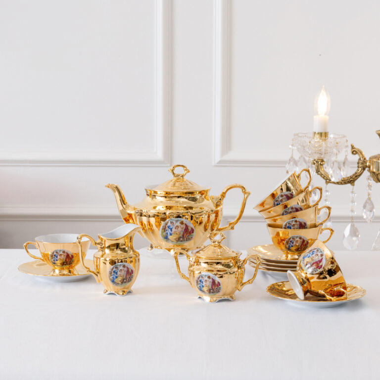 Bộ sản phẩm: 1 ấm trà, 1 âu đường, 1 âu sữa, 6 chén 6 đĩa mạ vàng 24k