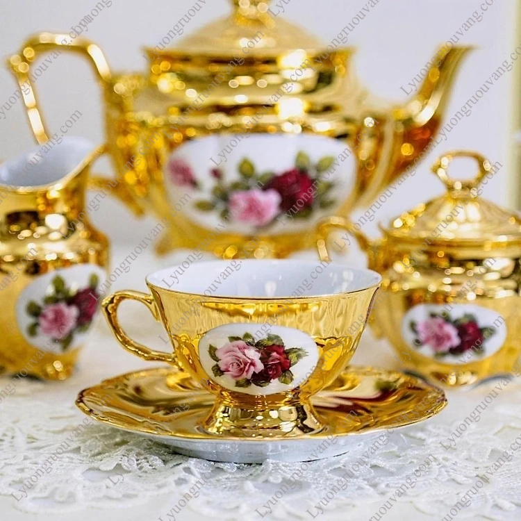 Bộ sản phẩm: 1 ấm trà, 1 âu đường, 1 âu sữa, 6 chén 6 đĩa mạ vàng 24k
