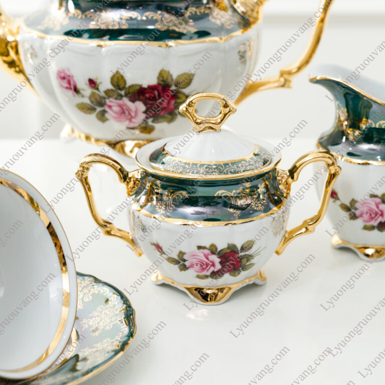 Bộ sản phẩm: 1 ấm trà, 1 âu đường, 1 âu sữa, 6 chén 6 đĩa mạ vàng 24k