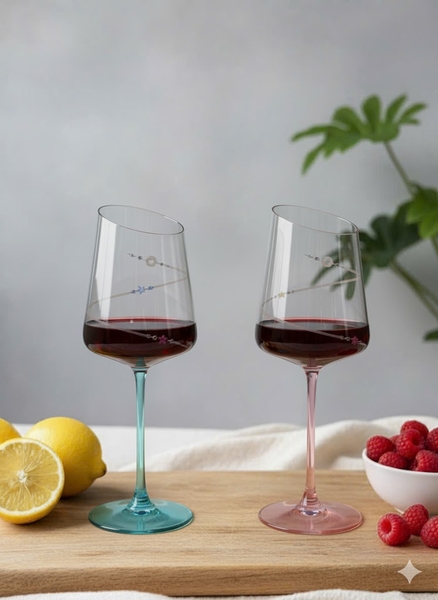 Hai ly có màu thân xanh ngọc và hồng pastel nhẹ nhàng, tạo nên vẻ đẹp hiện đại, phù hợp cho không gian nhà hàng, quán rượu, hay bàn tiệc sang trọng tại gia.